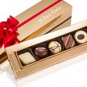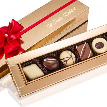 Zestaw sześciu pralinek zapakowanych w elegancki złoty kartonik. Każda pralina wypełniona jest innym nadzieniem oblanym białą, mleczną lub deserową czekoladą. Wieczko opakowania zdobi dedykacja: "W Dniu Kobiet". Całość zdobi czerwona wstążka z efektowną kokardą.