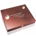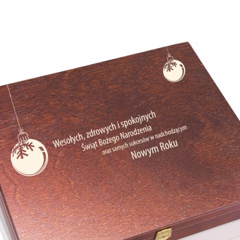 Ta elegancka drewniana szkatułka w ciemnym odcieniu z grawerem „Wesołych, zdrowych i spokojnych Świąt Bożego Narodzenia oraz samych sukcesów w nadchodzącym Nowym Roku” kryje w sobie 64 ręcznie robione praliny o bogatej palecie smaków i aromatów.