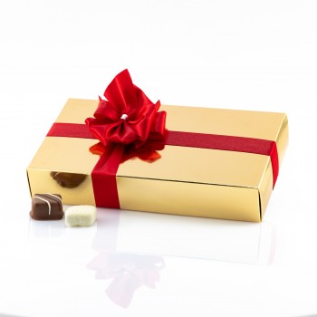 W eleganckim złotym pudełku przewiązanym czerwoną wstążką kryje się 18 ręcznie robionych pralin o wyjątkowych smakach i aromatach. Każda pralina to połączenie najwyższej jakości czekolady z delikatnymi nadzieniami – marcepanowymi, orzechowymi, owocowymi, kawowymi, karmelowymi czy bakaliowymi.