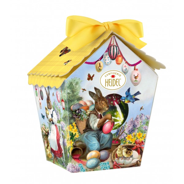 Ten wyjątkowy zestaw czekoladek zapakowany jest w dekoracyjny kartonik w kształcie wiosennej ptaszarni, który od razu przyciąga wzrok i buduje świąteczny klimat. Subtelne, pastelowe kolory, motywy wielkanocne oraz ozdobna kokarda sprawiają, że opakowanie prezentuje się elegancko i niezwykle dekoracyjnie. Kartonowe pudełko stylizowane na budkę dla ptaków nie jest zwykłym opakowaniem – to element, który tworzy całą historię produktu. Idealnie wpisuje się w wiosenną atmosferę Wielkanocy i pięknie prezentuje się na świątecznym stole, w koszyczku lub jako samodzielny upominek.