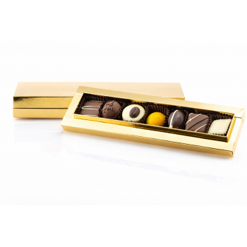 Zestaw sześciu pralinek zapakowanych w elegancki złoty kartonik. Każda pralina wypełniona jest innym nadzieniem oblanym białą, mleczną lub deserową czekoladą. Całość zdobi atłasowa wstążka w modnym beżowym odcieniu.
