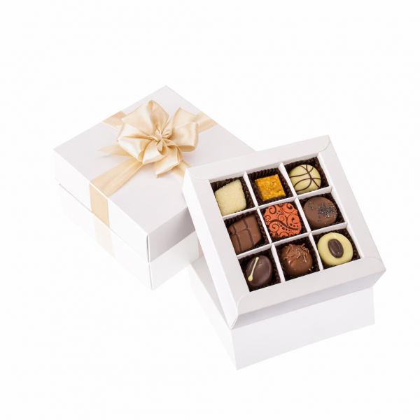 Stylowy zestaw 9 pralin premium zapakowanych w białe, matowe opakowanie o minimalistycznym, nowoczesnym charakterze. Każda pralina została starannie wykonana i ozdobiona, oferując różnorodność smaków, faktur i wykończeń, które zachwycają zarówno wyglądem, jak i smakiem. Pudełko przewiązane jasnobeżową, elegancką wstążką podkreśla luksusowy charakter produktu i sprawia, że zestaw jest gotowym do wręczenia prezentem. Idealny wybór na urodziny, podziękowania, święta, upominek biznesowy lub stylowy prezent bez okazji.