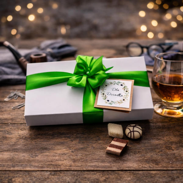 Każda pralina została starannie wykonana ręcznie i wypełniona pysznym, aksamitnym nadzieniem, które rozpływa się w ustach. To słodycze tworzone z pasją – idealne dla osób ceniących wyjątkowy smak i estetykę. Opakowanie ozdobiliśmy zieloną wstążką oraz bilecikiem z napisem: "Dla Dziadka".