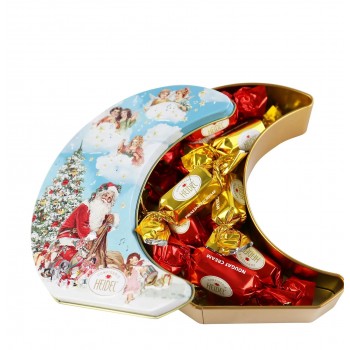Wprowadź magię Świąt do swojego domu dzięki wyjątkowej puszce w kształcie księżyca. Ten elegancki, kolekcjonerski pojemnik ozdobiony klasycznymi ilustracjami Świętego Mikołaja i aniołków to prawdziwe dzieło sztuki, które łączy w sobie urok tradycji i najwyższą jakość czekolady.