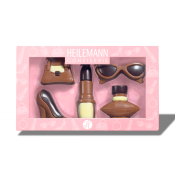 Odkryj wyjątkowy zestaw czekoladowych gadżetów kobiecych. W różowym opakowaniu znajdziesz ręcznie wykonane figurki z delikatnej mlecznej czekolady, przedstawiające damskie akcesoria: szpilkę, torebkę, szminkę, okulary przeciwsłoneczne i flakonik perfum. Ten zestaw to idealny pomysł na prezent dla kobiet, które kochają słodycze i dobry styl.