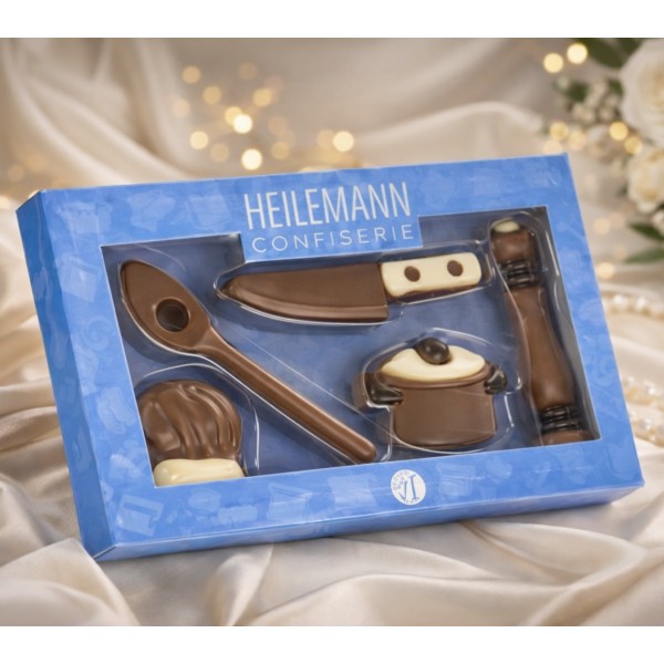Dla szefów kuchni i smakoszy proponujemy zestaw niezbędnych kuchennych pomocników w czekoladowej odsłonie. Młynek do pieprzu, garnek do gotowania, nóż kuchenny, drewniana łyżka i czapka szefa kuchni to kwintesencja rozkoszy, jaką daje wyśmienita mleczna czekolada.