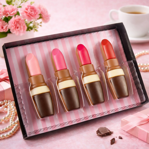 Zachwycający zestaw 4 ręcznie wykonanych pomadek z najwyższej jakości mlecznej czekolady to idealne połączenie elegancji i smaku. Każda pomadka została ozdobiona kolorową masą dekoracyjną, co nadaje jej wyjątkowy, realistyczny wygląd przypominający prawdziwe kosmetyki.