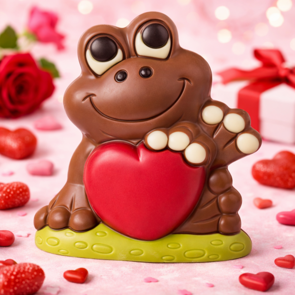 Piękna czekoladowa żaba z wielkim sercem. Wspaniały upominek dla ukochanej osoby, zapakowany w torebkę celofanową ozdobioną czerwoną kokardą. Figurka wykonana z mlecznej czekolady.