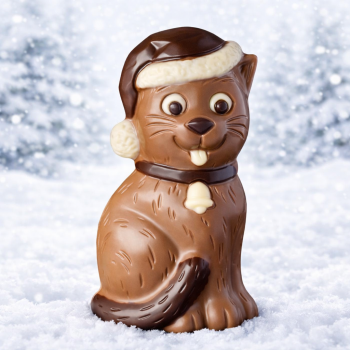 Uroczy kotek z czapeczką i dzwoneczkiem wykonany z pysznej mlecznej czekolady. Słodka figurka z pewnością wywoła uśmiech na twarzy nie jednej młodej damy. Czekoladowy kotek zapakowany jest w torebkę celofanową z czerwoną kokardką.