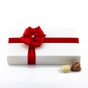 W stylowym białym pudełku ozdobionym czerwoną wstążką i kokardą kryje się 18 ręcznie robionych pralin o wyjątkowych smakach i nadzieniach. Każda z nich to połączenie najwyższej jakości czekolady z delikatnym wnętrzem – marcepanowym, orzechowym, owocowym, kawowym, karmelowym lub bakaliowym.