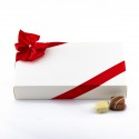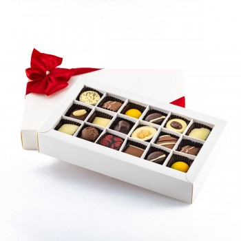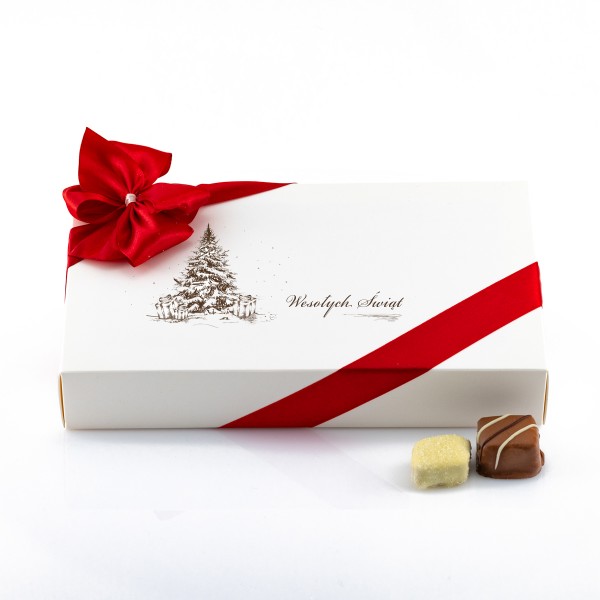 W stylowym białym pudełku z subtelnym grawerem choinki i napisem „Wesołych Świąt”, ozdobionym czerwoną wstążką z kokardą, kryje się 18 ręcznie robionych pralin w różnych smakach i kształtach.