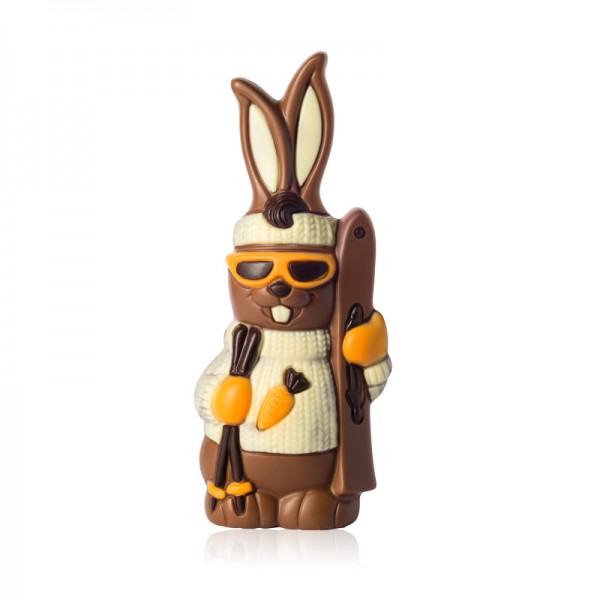Wielkanocny zajączek narciarz z mlecznej czekolady to wyjątkowa figurka, która łączy świąteczny klimat z nutą zimowej przygody. Zabawny zajączek w stroju narciarskim, z nartami i goglami, został wykonany z delikatnej mlecznej czekolady i ozdobiony dekoracyjnymi detalami z białej oraz deserowej czekolady.