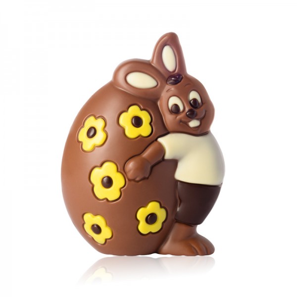 Uroczy zajączek wielkanocny z pisanką z mlecznej czekolady to wyjątkowa figurka, która doskonale oddaje radosny charakter Świąt Wielkanocnych. Wykonany z delikatnej mlecznej czekolady o kremowym smaku zajączek przytula dużą, dekoracyjną pisankę ozdobioną kwiatowymi motywami, co nadaje figurce wyjątkowy, świąteczny wygląd.