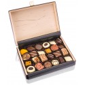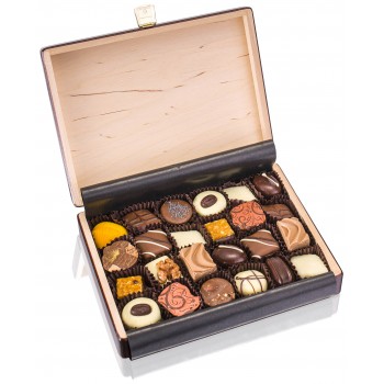 Wewnątrz szkatułki znajduje się starannie skomponowany zestaw czekoladowych pralin nadziewanych, przygotowanych z najwyższej jakości czekolady. Każda pralina wyróżnia się unikalnym smakiem i wykończeniem – wśród nich znajdują się nadzienia orzechowe, karmelowe, nugatowe, owocowe, marcepanowe oraz nugatowe.